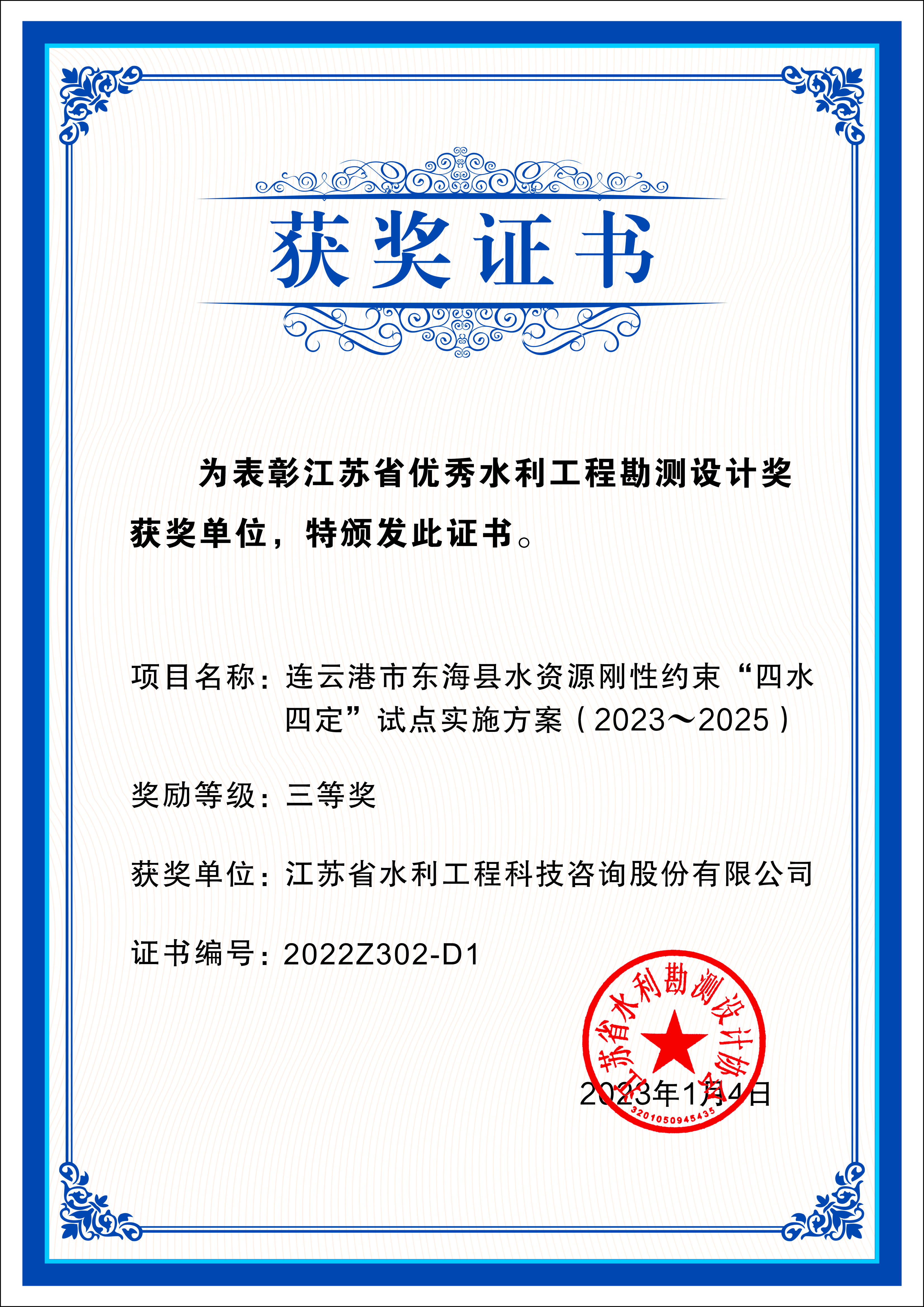 《連云港市東?h水資源剛性約束“四水四定”試定實(shí)施方案(2023-2025)》獲評(píng)“全省優(yōu)秀水利工程勘測(cè)設(shè)計(jì)獎(jiǎng)(規(guī)劃、咨詢類)三等獎(jiǎng)”。方案通過探索水資源剛性約束制度建設(shè)路徑,以水安全有效保障、水資源高效利用、水生態(tài)明顯改善為目標(biāo),推動(dòng)區(qū)域發(fā)展規(guī)模、結(jié)構(gòu)、布局優(yōu)化升級(jí),實(shí)現(xiàn)經(jīng)濟(jì)社會(huì)發(fā)展與水資源承載能力相適應(yīng),全面提升東海宜居宜業(yè)水平,塑造現(xiàn)代人水和諧共生關(guān)系,為東海高質(zhì)量發(fā)展提供水資源保障。